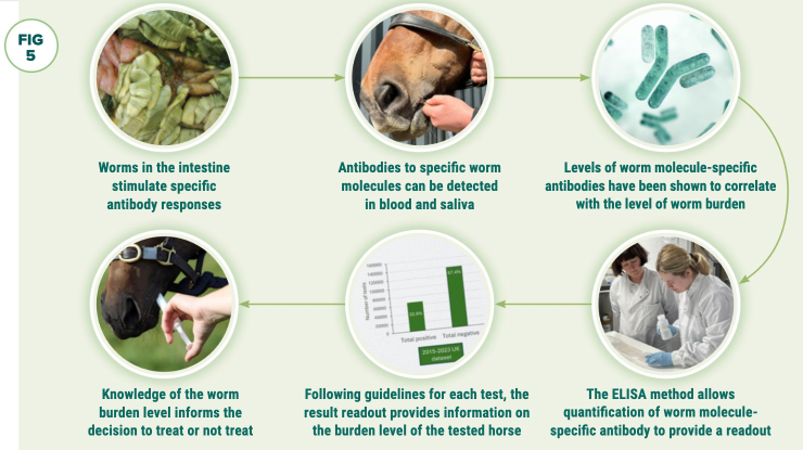 Most decisions regarding worming should be based on diagnostic testing. However, in certain high-risk situations, a strategic worming treatment approach may be more suitable as the available tests do not provide enough information to guide treatment decisions. Such situations include administering strategic treatments to young foals for ascarid infections and treating horses identified as being at high risk of significant small redworm encysted larval burdens. In all other cases, diagnostic tests should be used to inform treatment decisions. These tests include those that estimate worm egg numbers in dung (FECs, Fig. 4) and those that measure antibody responses to worms (Fig. 5).