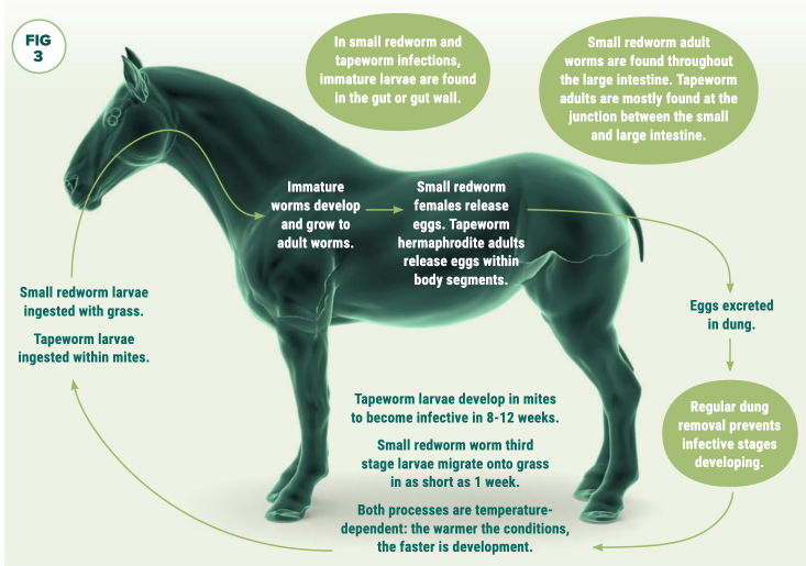 Nearly all horses are exposed to worms at some point. The most common are the small redworms (Fig. 1) and tapeworms (Fig. 2). Horses become infected with these parasites when they ingest contaminated grass (Fig. 3). Large burdens of small redworms can cause weight loss, diarrhoea or colic, particularly in horses under five [1]. This is because some horses can accumulate considerable burdens (10,000s-1,000,000s) of small redworm larvae in their gut wall, and when these larvae emerge in large numbers, they cause severe damage. Tapeworms can also cause colic [2]. Immunity to both parasites develops gradually, and some horses remain susceptible throughout life, especially if they graze heavily contaminated fields or have weakened immune systems. Ascarids, a type of roundworm, affect foals and are commonly found on breeding farms [3]. While these worms are less of an issue as foals mature, infections can cause long-lasting lung damage due to the ascarid migratory life cycle.