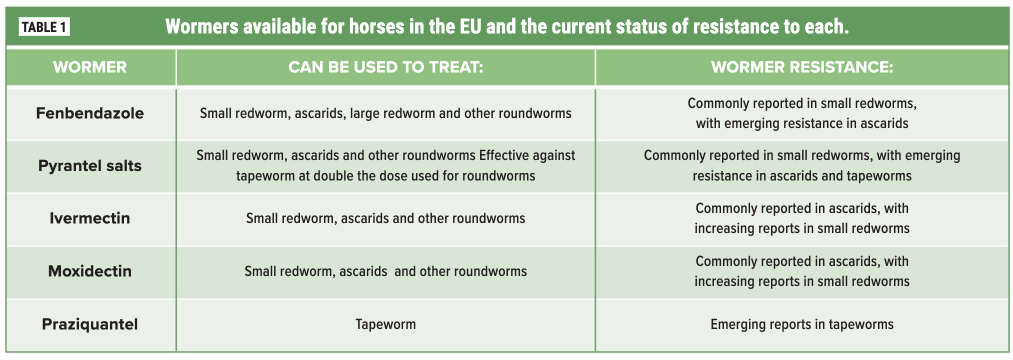 There is a limited selection of medications available for treating equine worm infections, and unfortunately, resistance has been reported against all types of wormers (Table 1). It is therefore essential to balance the need for worming with the preservation of these medicines for horses that have high parasite burdens that require treatment. To effectively manage this balance, evidence-based programmes are necessary. These programmes must include risk assessments, diagnostic testing and the avoidance of practices that contribute to the spread of worms.