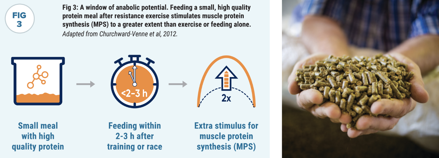 Racehorses, like many sporthorses, are typically fed large, infrequent meals often disconnected from training sessions. Although more specific research in horses is needed, providing smaller but high quality protein meals several times a day, with 1 meal post-exercise, will have a beneficial effect on muscle protein synthesis and recovery.