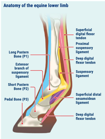 The SDFT is the continuation of the superficial digital flexor muscle, the top of the tendon attaches to the humerus, radius and ulna. The tendon proper begins on the back of the lower radius and extends down the surface of the limb, lying superficially to the deep digital flexor tendon (DDFT) and making it readily palpable along the length of the metacarpus or commonly known, cannon bone. Enclosed within the flexor tendon sheath, the SDFT glides over the DDFT and suspensory ligament, maintaining close anatomical relationships that are critical to their function. Just above the fetlock, the superficial flexor tendon forms a small “tunnel” of tissue that the deep flexor tendon passes through before continuing down the leg. At the level of the pastern, the SDFT divides into two branches that insert on both the long pastern (P1) and the short pastern (P2). Functionally, the SDFT acts not only as a flexor of the pedal bone/foot (P3) but also as a vital part of the passive stay apparatus, resisting over-extension of the fetlock and pastern joints. Its elastic properties allow it to store and release energy during locomotion, making it a key contributor to the horse's stride efficiency.
