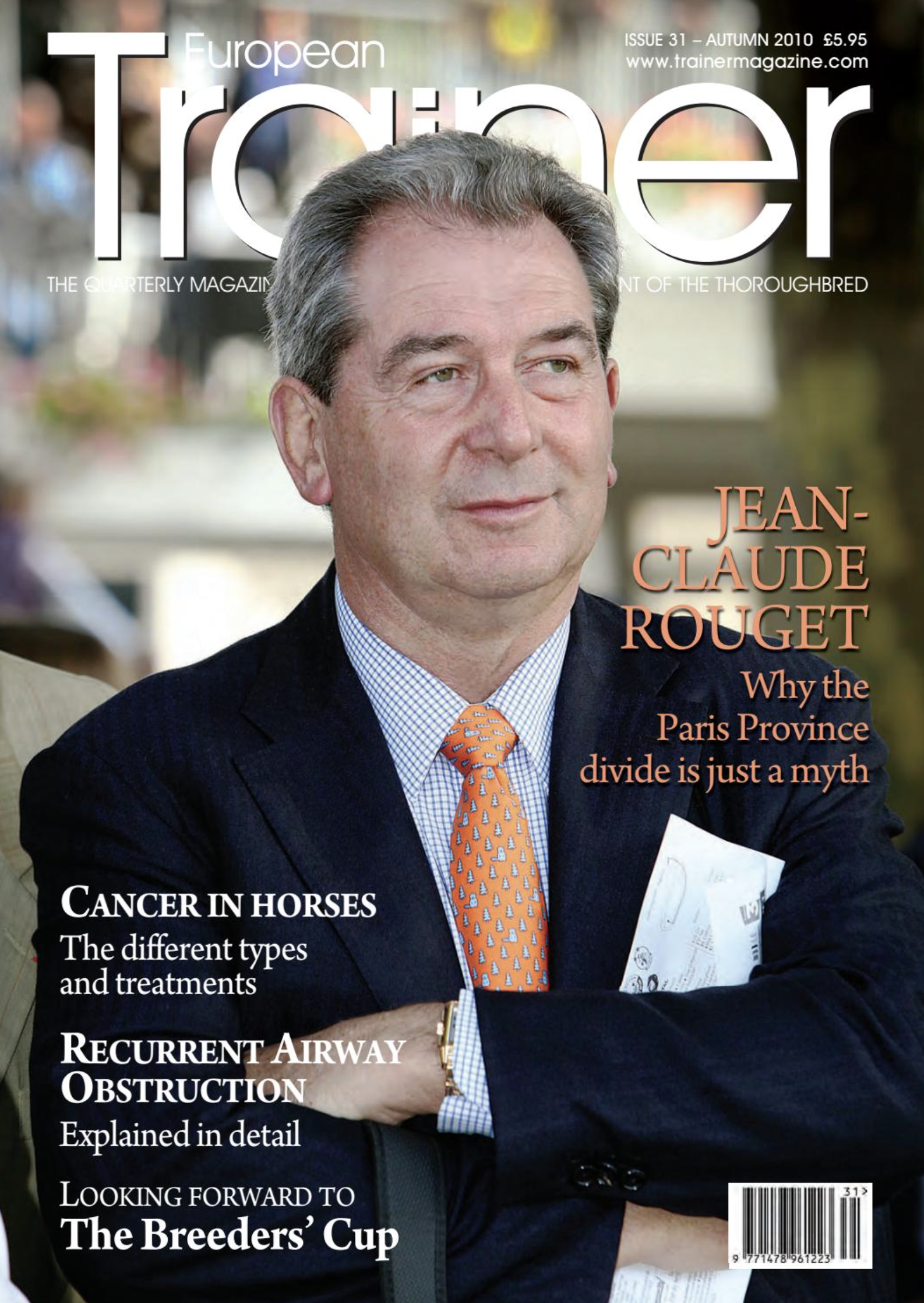Autumn 2010 - Issue 31 European Trainer Issue 1 Oct Written By Webmaster Click on the cover to read this issue! Featured Oct 18, 2010 The Big 'C' Oct 18, 2010 Oct 18, 2010 Oct 1, 2010 Recurrent Airway Obstruction Oct 1, 2010 Oct 1, 2010 Oct 1, 2010 Vibration Therapy Oct 1, 2010 Oct 1, 2010 Sep 30, 2010 Gerhard Schöningh - the white knight of Hoppegarten racecourse Sep 30, 2010 Sep 30, 2010 Sep 30, 2010 Leading racehorse trainers discuss what's best for horse racing - synthetic racetrack surfaces or traditional dirt tracks Sep 30, 2010 Sep 30, 2010 Sep 30, 2010 Butch Lehr - the Churchill Downs racetrack superintendent in profile Sep 30, 2010 Sep 30, 2010 Sep 30, 2010 Weight allowances - do fillies and mares get a raw deal? Sep 30, 2010 Sep 30, 2010 Sep 30, 2010 Can nutrition give horses that "first class" travel experience? Sep 30, 2010 Sep 30, 2010 Aug 27, 2010 Jean-Claude Rouget, the leading French racehorse trainer, in profile Aug 27, 2010 Aug 27, 2010 Aug 27, 2010 Calvin Borel - the leading Kentucky Derby winning jockey in profile Aug 27, 2010 Aug 27, 2010 Aug 10, 2010 The TRM Trainer of the Quarter - Dermot Weld Aug 10, 2010 Aug 10, 2010 SUBSCRIBE HERE COVER PROFILE - Jean-Claude RougetSex allowances Nutrition and Transport Gerhard SchöninghRecurrent Airway Obstruction Vibration therapyBREEDERS CUP SPECIALIn focus - trainers on the synthetic V dirt surface debateCancer Jean-Claude RougetEuropean TrainerEUT31 Webmaster