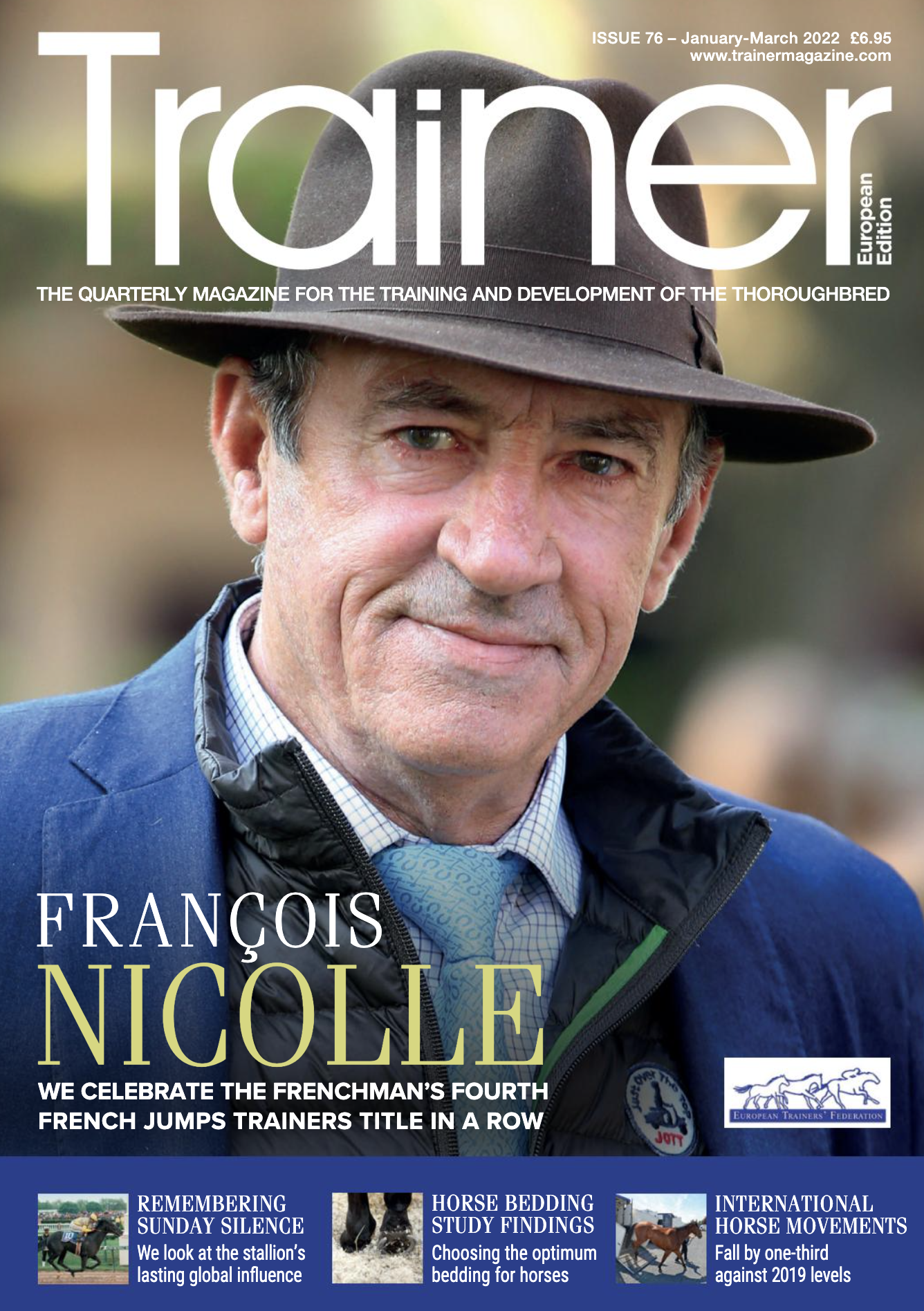 January - March 2022 - issue 76 European Trainer Issue 1 Jan Written By Web Master SUBSCRIBE HERE Click on the cover to read this issue! Contents in this issue includes: Featured Racing, Sunday Silence, EUT76, Batch 5 Remembering Sunday Silence and his lasting global influence Racing, Sunday Silence, EUT76, Batch 5 Racing, Sunday Silence, EUT76, Batch 5 Water Treadmills, Racehorse Training, EUT76, Batch 5 Water treadmills – what can they offer our racehorses? Water Treadmills, Racehorse Training, EUT76, Batch 5 Water Treadmills, Racehorse Training, EUT76, Batch 5 EMHF update, Transport, European Horseracing, Movement of horses, Import, Export, EUT76, Batch 5 International Horse Movement - under the spotlight EMHF update, Transport, European Horseracing, Movement of horses, Import, Export, EUT76, Batch 5 EMHF update, Transport, European Horseracing, Movement of horses, Import, Export, EUT76, Batch 5 Horse Bedding, Stable Hygiene, Horse Bedding Study, EUT76, Batch 5 Horse Bedding: Beware the Marketing Hype Horse Bedding, Stable Hygiene, Horse Bedding Study, EUT76, Batch 5 Horse Bedding, Stable Hygiene, Horse Bedding Study, EUT76, Batch 5 Racecourse Stewarding, Racecourse Officials, Volunteering, Professional Stewards, EUT76, Batch 5 Raceday Stewards - What can racing learn from other sports who employ professional officials? Racecourse Stewarding, Racecourse Officials, Volunteering, Professional Stewards, EUT76, Batch 5 Racecourse Stewarding, Racecourse Officials, Volunteering, Professional Stewards, EUT76, Batch 5 Scandinavian Racing, Horseracing Rules, EMHF update, IFHA, EUT76, Batch 5 Scandanavian Horse Racing Breaks New Ground with Common Rules Book Scandinavian Racing, Horseracing Rules, EMHF update, IFHA, EUT76, Batch 5 Scandinavian Racing, Horseracing Rules, EMHF update, IFHA, EUT76, Batch 5 Bone Health, Bone Density, Racehorse Nutrition, EUT76, Batch 5 Racehorse Bone Health: From a Nutritional Perspective Bone Health, Bone Density, Racehorse Nutrition, EUT76, Batch 5 Bone Health, Bone Density, Racehorse Nutrition, EUT76, Batch 5 Racehorse Nutrition, Gut health, Leaky Gut Syndrome, Equine Stress, Digestive Health, EUT76, Batch 5 Gut Health - Aspects of bad behaviour and how to fix it Racehorse Nutrition, Gut health, Leaky Gut Syndrome, Equine Stress, Digestive Health, EUT76, Batch 5 Racehorse Nutrition, Gut health, Leaky Gut Syndrome, Equine Stress, Digestive Health, EUT76, Batch 5 Racehorse Behaviour, Equine Behaviour, Behavioural Conditioning, Racehorse Training, EUT76, Batch 5 Training - 'horses with attitude' Racehorse Behaviour, Equine Behaviour, Behavioural Conditioning, Racehorse Training, EUT76, Batch 5 Racehorse Behaviour, Equine Behaviour, Behavioural Conditioning, Racehorse Training, EUT76, Batch 5 Trainer of the Quarter, Francois Nicolle, EUT76, Batch 5 TopSpec Trainer of the Quarter - François Nicolle Trainer of the Quarter, Francois Nicolle, EUT76, Batch 5 Trainer of the Quarter, Francois Nicolle, EUT76, Batch 5 EUT76 Web Master