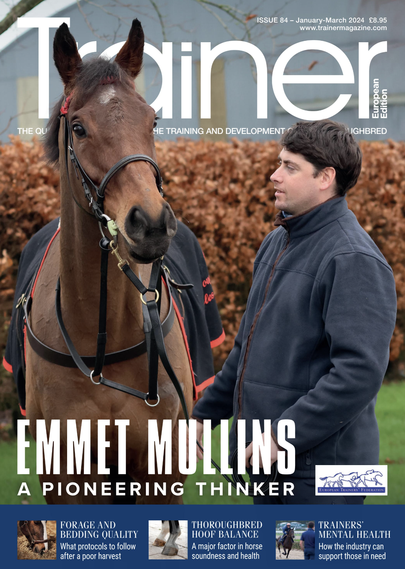January - March 2024 - issue 84 European Trainer Issue 1 Jan Written By Webmaster SUBSCRIBE HERE Click on the cover to read this issue! CONTENTS IN THIS ISSUE INCLUDE: Featured Emmet Mullins - the Irish National Hunt trainer who has had no shortage of success - a common trait in the Mullins clan! Topspec Trainer of the Quarter - Mick Appleby Steps to take in order to prevent respiratory disease after a poor harvest “It’s a struggle…” The mental wellbeing of trainers and how to support them. The role of the lymphatic system in energy metabolism What we learnt at the first carbon-neutral horseracing industry conference Tokyo Calling – Documenting Iresine’s journey from rural France to the Japan Cup Updates from the EMHF and we learn about Europe's latest beach racecourse - Zahara de los Atunes The importance of good hoof balance to improve performance Stem Cell Therapy - the improved diagnostics available to treat lameness EUT84 Webmaster
